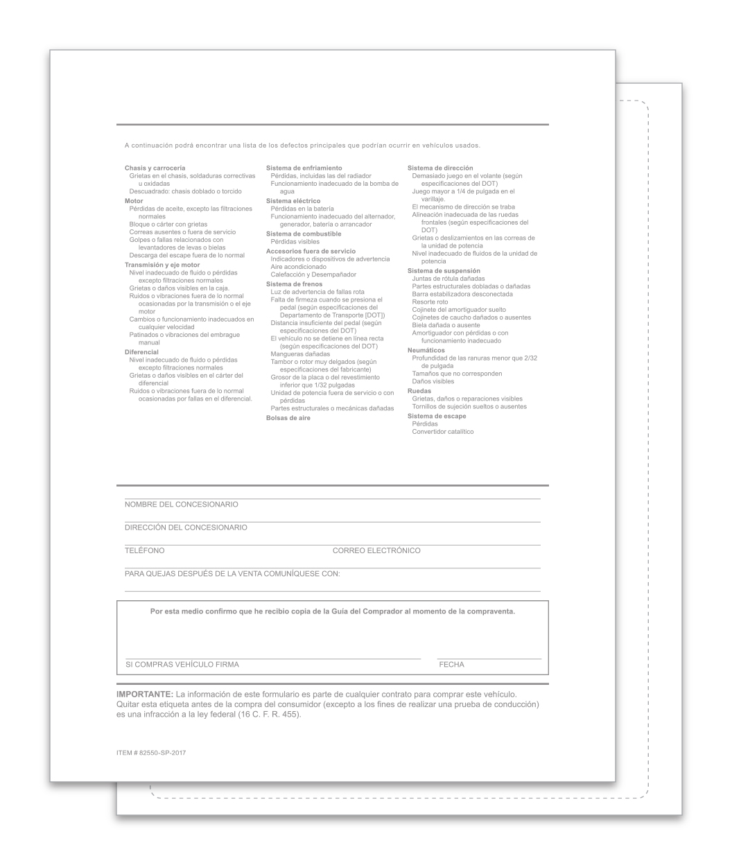 These fade-resistant Buyers Guides have “Permanent Adhesive On All 4 Sides” to adhere to the outside of the vehicle window. Stay in compliance with current FTC regulations with these easy to use forms. These popular forms are laser compatible and easy to remove.