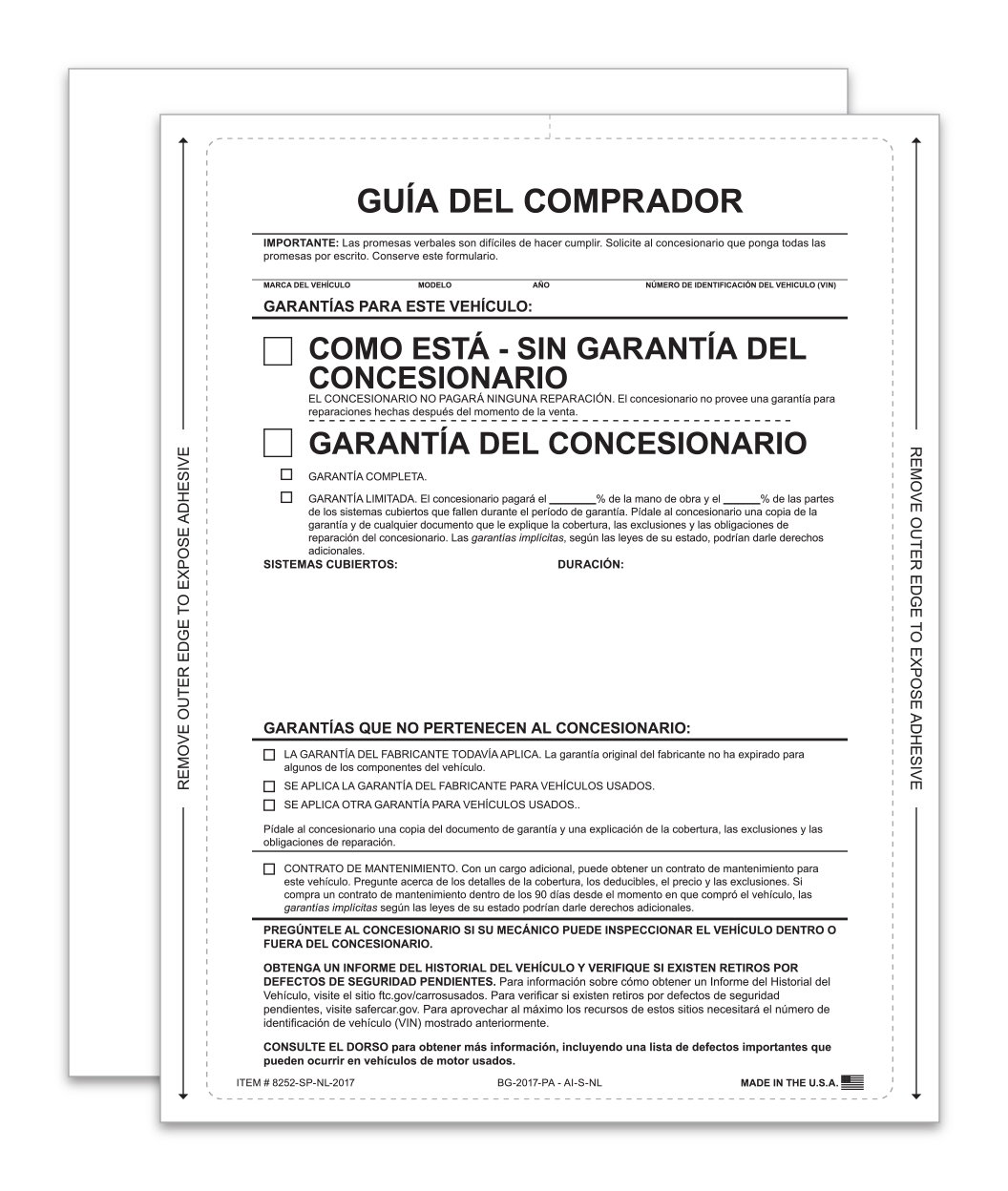 These fade-resistant Buyers Guides have “Permanent Adhesive On All 4 Sides” to adhere to the inside or outside of the vehicle window. Stay in compliance with current FTC regulations with these easy to use forms. These popular forms are laser compatible and easy to remove.
