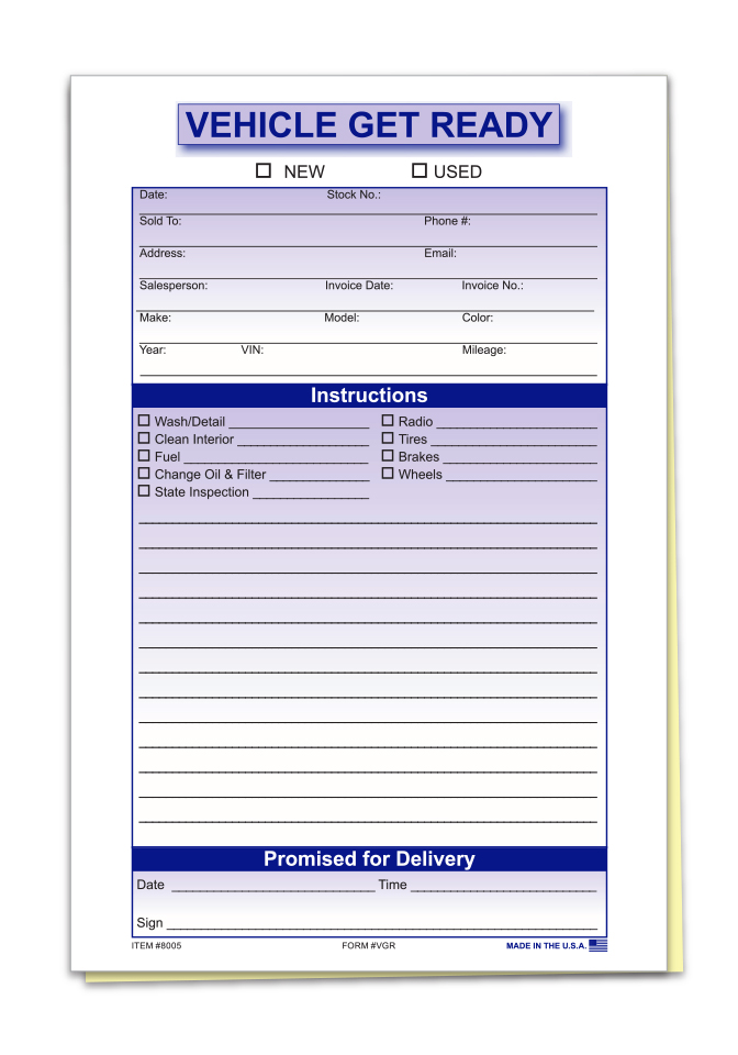 This convenient form includes detailed information about the vehicle and communicates specific information for delivery of the vehicle, exactly as promised.