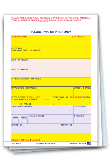 Vehicle Deal Label - AA-168-P/A-3 - Perm. Adh. - 3 Part - Qty. 100