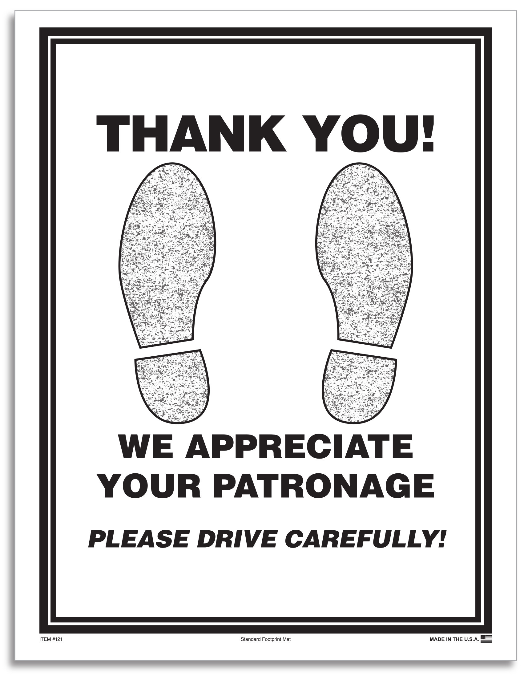 - Imprint: "Thank You!" - "We appreciate your patronage - Please drive carefully!" - Footprints