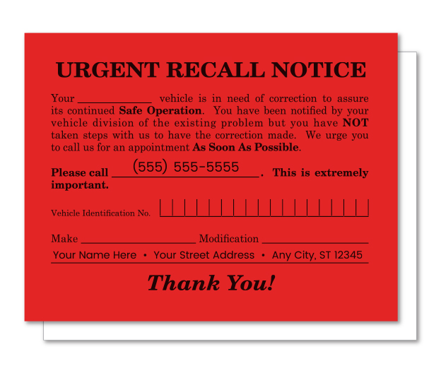 This Urgent Recall Notice really gets attention from your customers. This bright red fluorescent notice is printed in black ink.