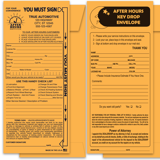 This compact envelope is another great option to provide after hours service. Ideal for dealerships that require a narrow envelope! Great way to personalize your night drop envelope to meet your needs! We can also match any existing envelope.