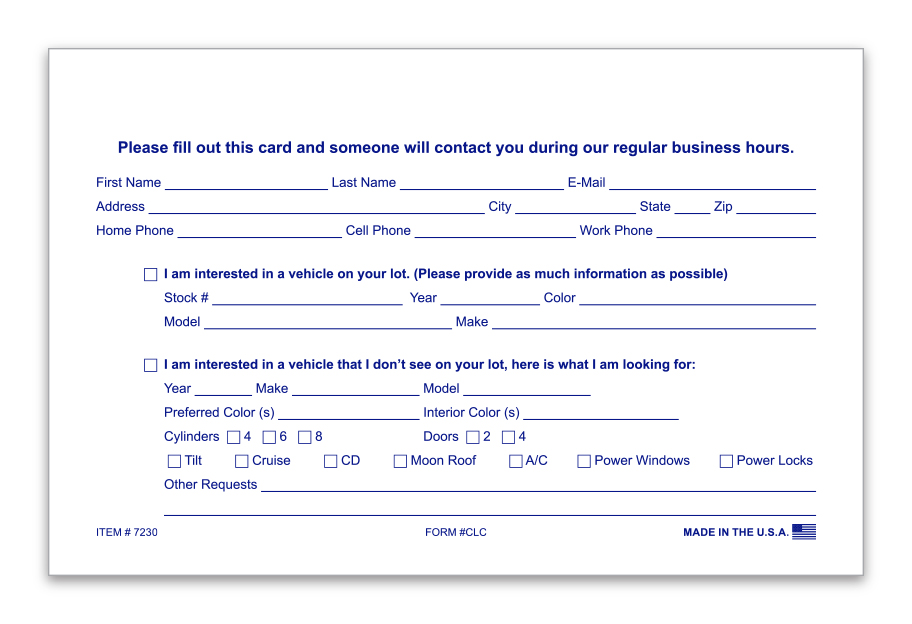 These heavy duty cards are great for keeping track of potential customers. Capture customer name, contact information and vehicles of interest in this simple to use card. Cards can be used in sales offices or with After Hours Shopper Box.
