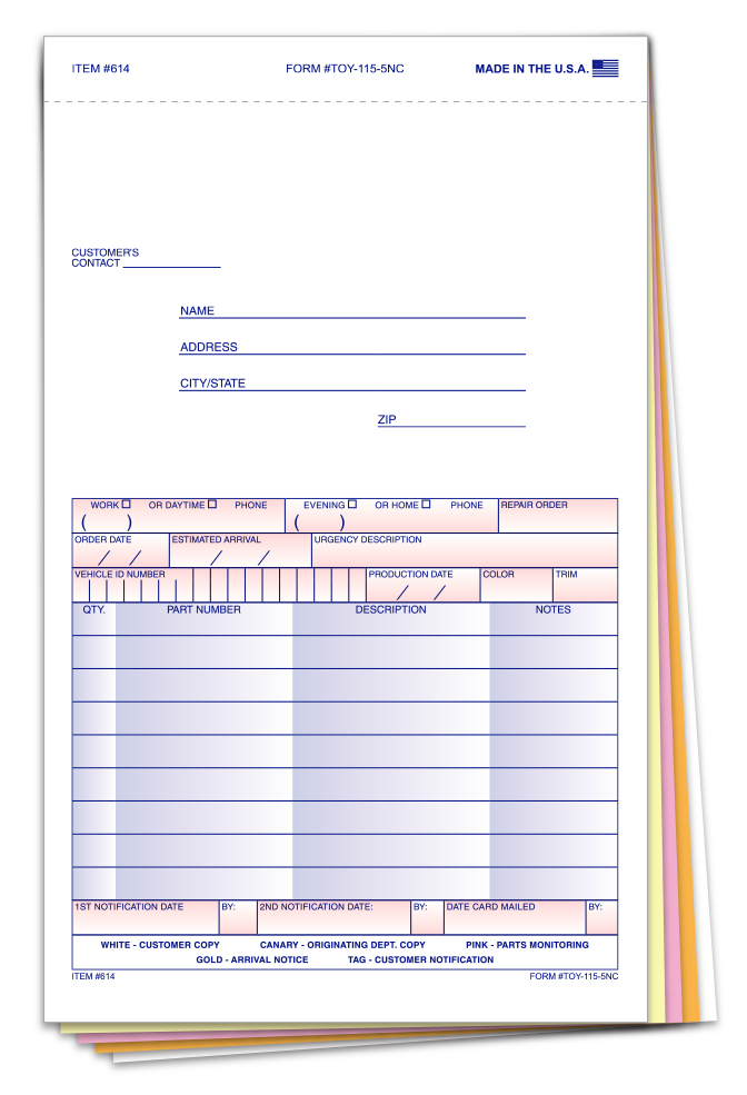 Special Parts Order Form - TOY-115-5NC - Qty. 100