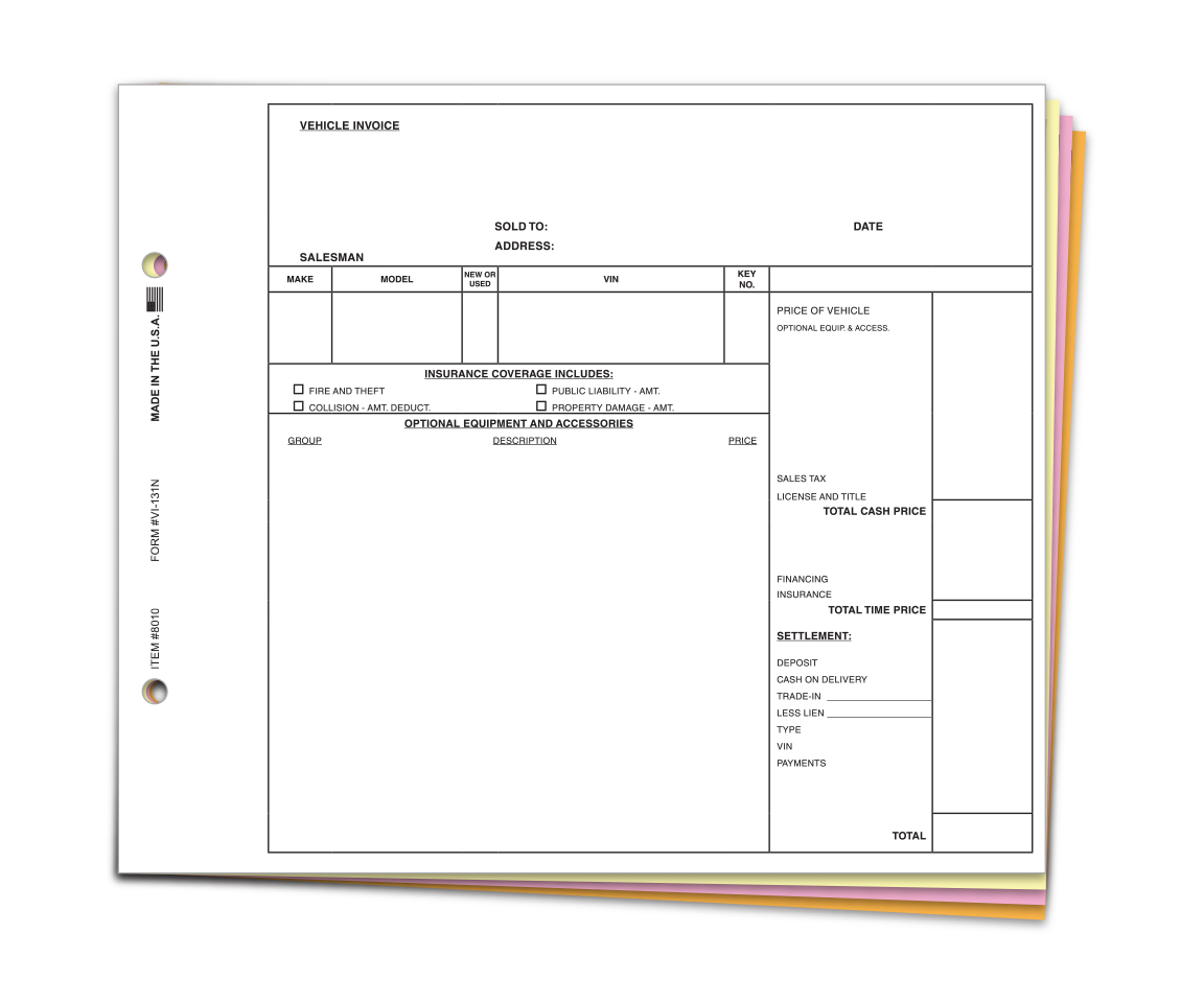 Four-part universal vehicle invoice. This invoice has large areas for vehicle identification information and for optional equipment and accessories. Easy to use.