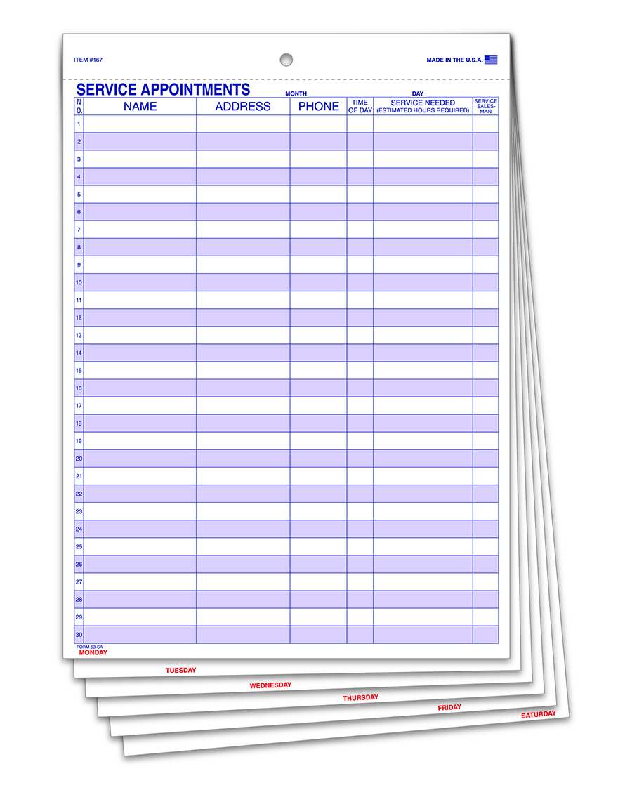 An easy way to organize and schedule daily work. Each sheet is identified from Monday through Saturday. 30 lines per side, 60 lines per day total.