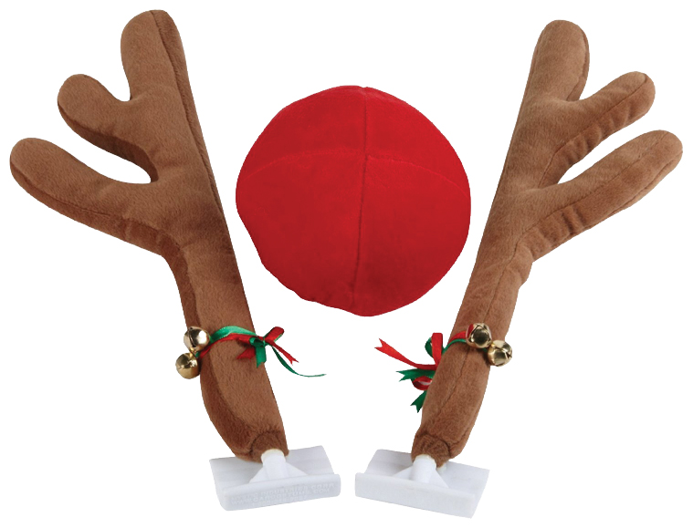 - Kit consists of two 17" antlers with window clips and one 6" red fabric nose.