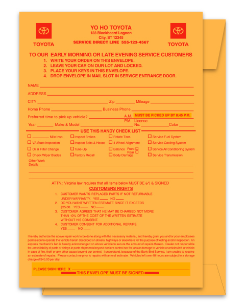 These night drop envelopes are made of heavy duty 24# white wove stock. The envelopes are the perfect size - large enough to hold keys with remote and compact enough to fit through doors and not overload your box. Great way to personalize your night drop envelope to meet your needs! We can also match any existing envelope.